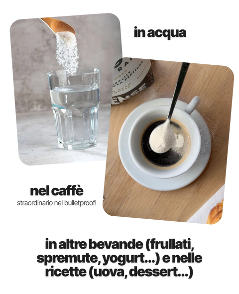 Il nostro collagene si scioglie al volo in caffè, acqua, tisane, latte, yogurt, frullati o brodo; ottimo anche in ricette (pancake, creme, zuppe).