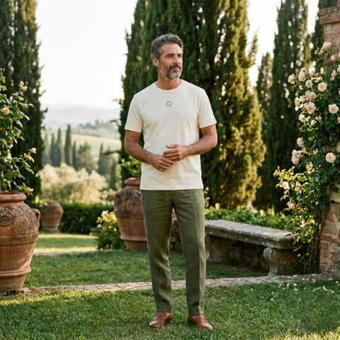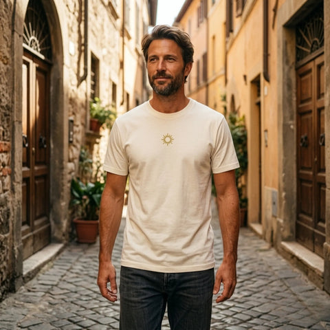 100% Made in Italy. Sartoria artigianale. Ogni t-shirt cucita a mano con cura e attenzione ai dettagli.